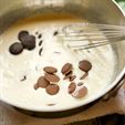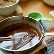 #6: Turn off the heat and add the chocolate. Whisk until the discs of chocolate are melted. Add the butter and whisk until the mixture is nice and smooth.