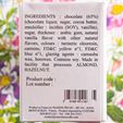 ingredients: chocolate (65%) (chocoate liquor, sugar, cocoa butter, soy lechithin, vanillin), sugar, gum arabic, natural vanilla flavor with other natural flavors, coloursL turmeric oleorecin, carmine, FDC yellow #1, FDC blue #1, carbauba wax, beeswax. Contain soy. May contain almonds and hazelnuts